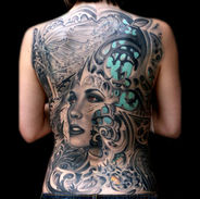 Rember Orellana tattoos with a style as unique as his background. Born in Guatemala, his boxing career ended early due to a permanently detached retina. At first a tragic turn, Rember soon recognized it as a hidden asset by giving him an altered perspective for depth and dimension in his art. His hyper-realistic tattoo art mixes smoothly with surrealism and gothic architecture to create truly amazing images in the art of tattooing. Working easily in black and gray or color or blending it all with sepia tones, Rember’s art captures his personal creative vision to create skin art of inspiration and mystery.